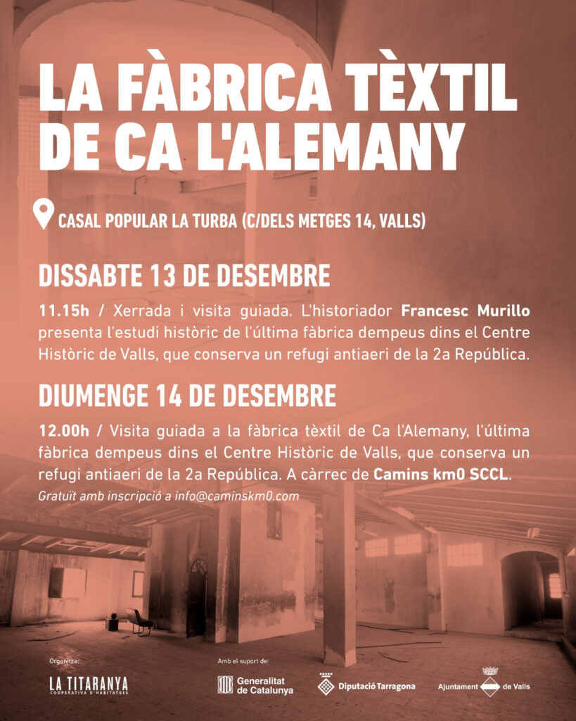 12h Visita guiada a la fàbrica tèxtil de Ca l’Alemany, l’última fàbrica dempeus dins el Centre Històric de Valls, que conserva un refugi antiaeri de la 2a República.